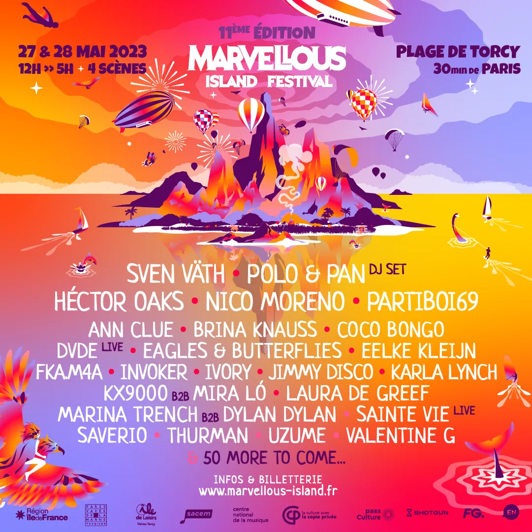 La 11e édition de MARVELLOUS ISLAND se tiendra les 27 & 28 mai (veille de lundi férié) 2023, dans sa configuration habituelle à savoir de midi jusqu’à cinq heures du matin sur la Plage de Torcy en Seine et Marne, en partenariat avec Radio FG.